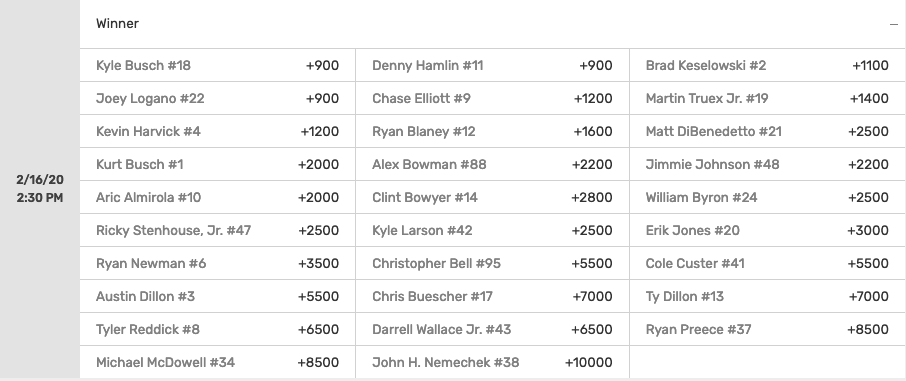 This Sunday will officially mark the start of the NASCAR season as well as the 61st running of the Daytona 500. Now everybody knows Daytona and Talladega are the most difficult tracks to bet on as car performance and raw talent usually take a back seat to strategy and luck on the 2.5 mile restrictor plate tracks. For these four super speedway races every year you won’t find much value betting on the favorites to win so instead look for underdogs to win and maybe some favorites to finish top 5. Another good bet for Daytona could be to fade drivers more prone to wrecking in Driver vs Driver matchups such as whoever you can find matched up against Daniel Suarez or Bubba Wallace. This strategy is what we could call the Danica Patrick strategy.